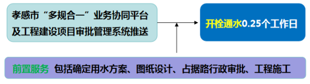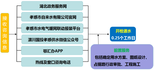 流程說明:供水企業(yè)通過孝感市“多規(guī)合一”業(yè)務(wù)協(xié)同平臺(tái)及工程建設(shè)項(xiàng)目審批管理系統(tǒng)推送獲取項(xiàng)目建設(shè)信息后主動(dòng)對(duì)接,先行開展確定用水方案、圖紙?jiān)O(shè)計(jì)、工程施工等服務(wù),辦理用水工程涉及的占道、掘路、占用綠地、伐移樹木等相關(guān)行政審批手續(xù),提前完成外線工程實(shí)施,為客戶提供“無(wú)感免申請(qǐng)”服務(wù)。客戶需要用水時(shí),0.25個(gè)工作日內(nèi)開栓通水。