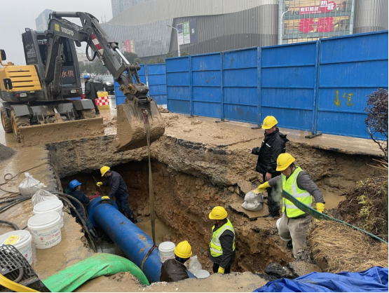 險情就是命令,凌晨1點,公司立即組織10余名搶修人員到場關(guān)閘止水。與此同時,技術(shù)人員、施工人員和設(shè)備設(shè)施“跑步前進”、同步到場,對破損溢水點進行邊開挖、邊診斷。為加快搶修速度,減少對周邊用戶的影響,30余名搶修人員頂著嚴寒天氣連夜搶修。