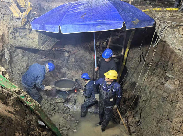 為將停水影響降至最低,運(yùn)維部經(jīng)周密研判,果斷決定將施工窗口期設(shè)定在深夜。技術(shù)人員連夜開挖探查,根據(jù)管道破損實(shí)際情況精準(zhǔn)制定多套維修方案,最終克服技術(shù)難題,選定高難度的帶水作業(yè)方案,最大限度縮短停水時(shí)長。