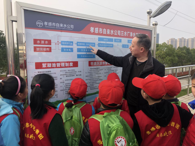 “我們城區的生活用水來自漢江,大家看看現在水池中水的顏色,我們接著往下參觀……”在公司三水廠工作人員的帶領和介紹下,小記者們看到了處理前的原水。由于他們大多是第一次參觀自來水廠,對每一步工序、每一處管道、每一種儀器都充滿好奇。他們有的在不停追問,仔細探究水處理過程中的每一點細微變化;有的認真做著記錄,若有所思,與家長和同學進行探討。