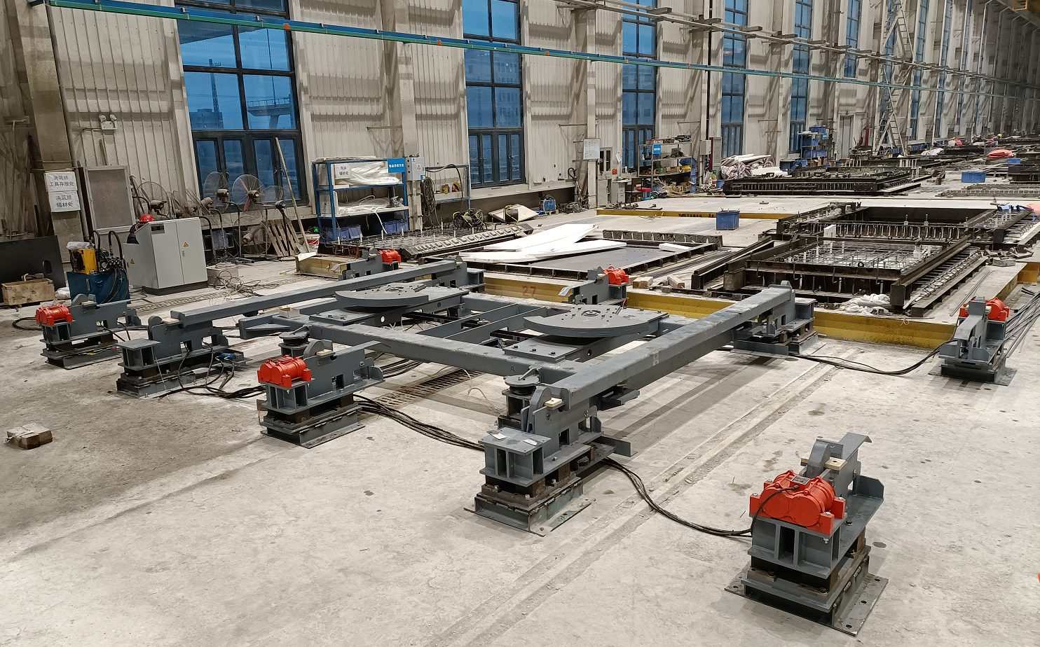 該振動臺為分體式結構,主要由振動系統、液壓夾持系統、模臺、流轉驅動系統及數字化控制系統等構成。工作時,上部模臺可流轉,振動時動態夾持為一體。該振動臺將混凝土密實過程分解為水平低頻鋪開及垂直中高頻定向振動兩個過程,垂直定向振動使能量精確聚焦,混凝土內空氣可以沿最短路徑厚度方向快速排出,并且消除常規振動系統的內耗問題。技術原理先進,振動密實效率高,優勢明顯。